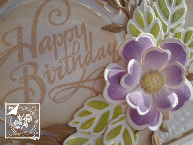 Ook de bloem en de blaadjes zijn gestanst uit creme kleurige cardstock en met inkt is er kleur op aangebracht. Mooi hé? Dit maakt de kaart helemaal gereed om hiermee de jarige te feliciteren....