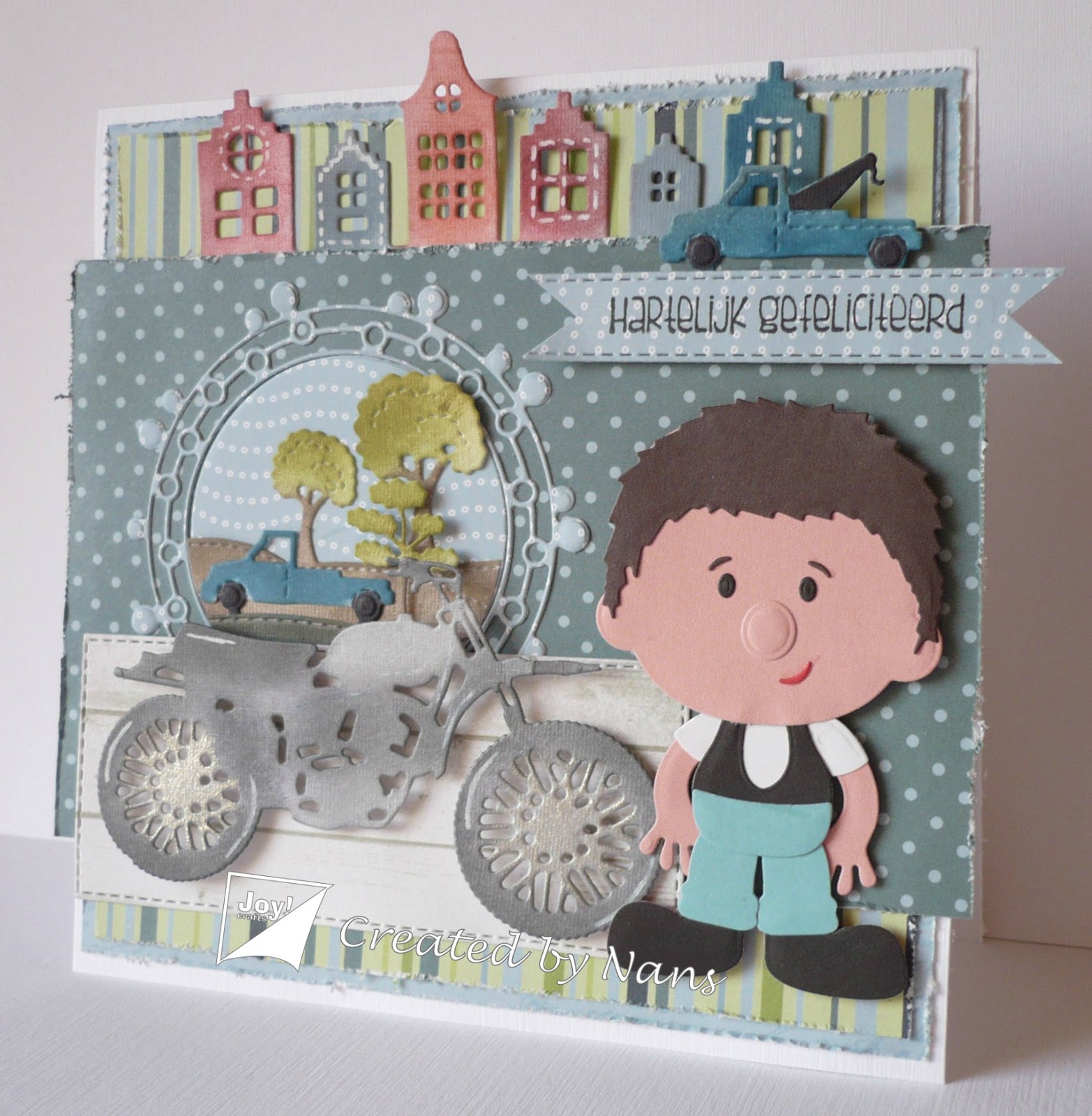 Voor deze jongenskaart heb ik enkele leuke items gebruikt uit de nieuwe collectie van Joy!Crafts. Zo is er o.a. een stencil van een stoere moto en de leuke jongenslijn van Mery's met auto's en vrachtwagens.