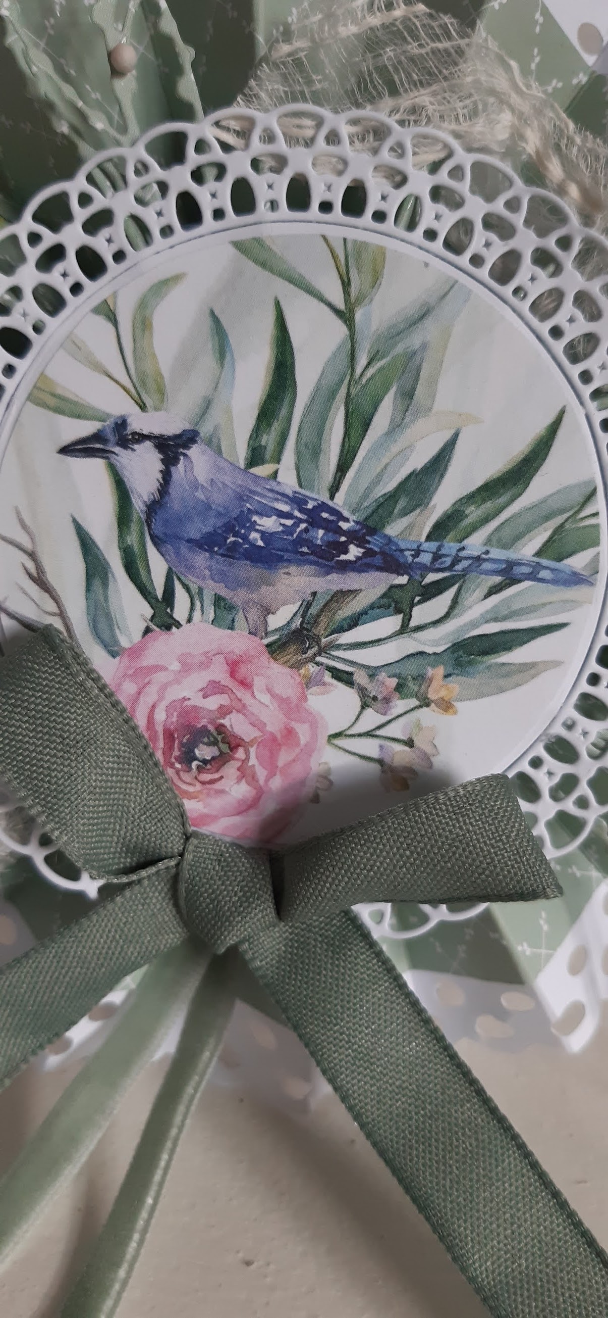 Ik vind het desingpapier Birds in Paradise (6011/0597) zo mooi dat ik ervoor gekozen heb om het designpapier in het midden van mijn rozet te gebruiken. Ik heb met de Angel mal dus nog een cirkel uit gestanst uit het designpapier.